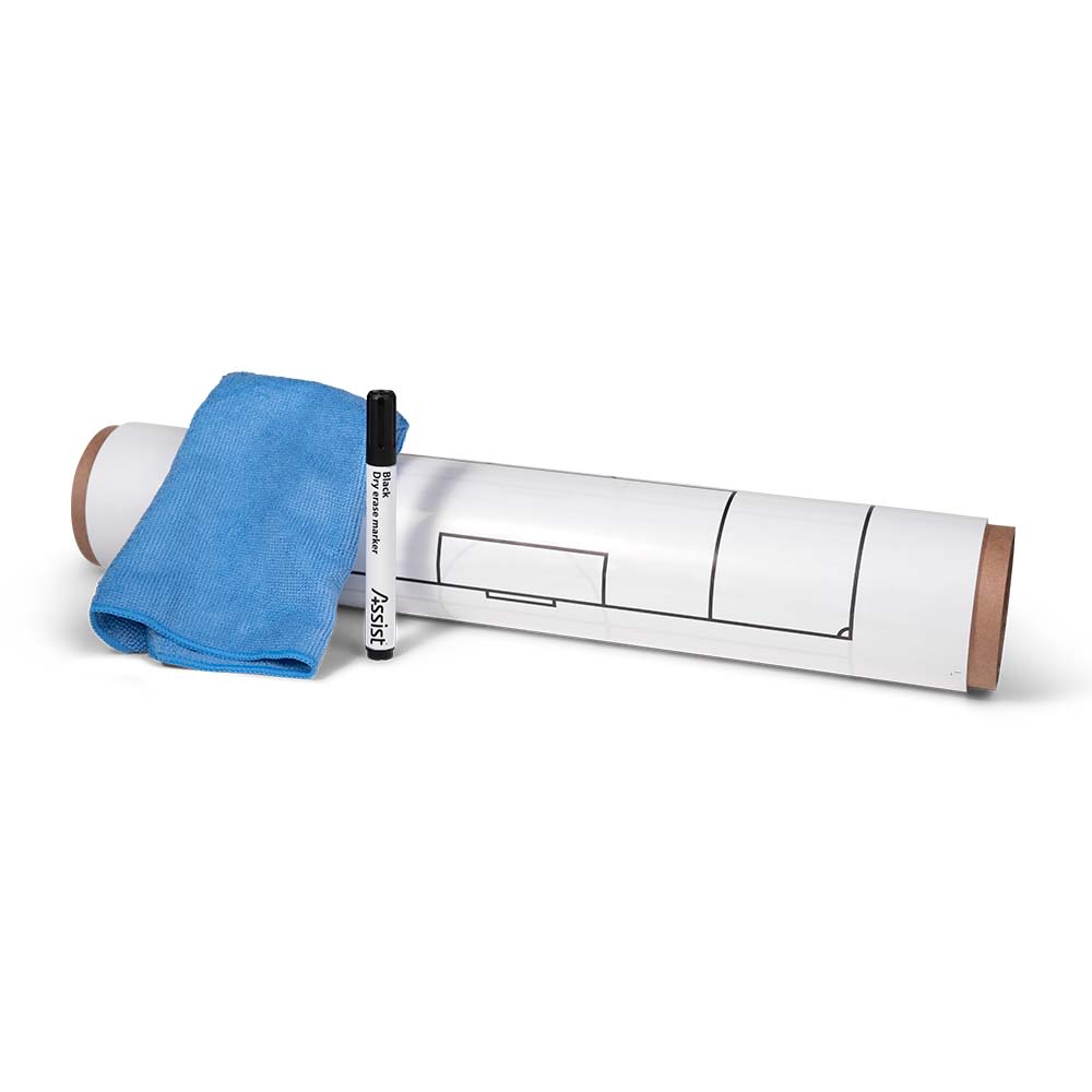 Med en selvklebende bakside kan arket festes til ulike flater, noe som gjør det fleksibelt og lett tilgjengelig. Hver pakke inneholder 25 ark i en dispenserboks, komplett med svart tavlepenn og klut for enkel skriving og visking.