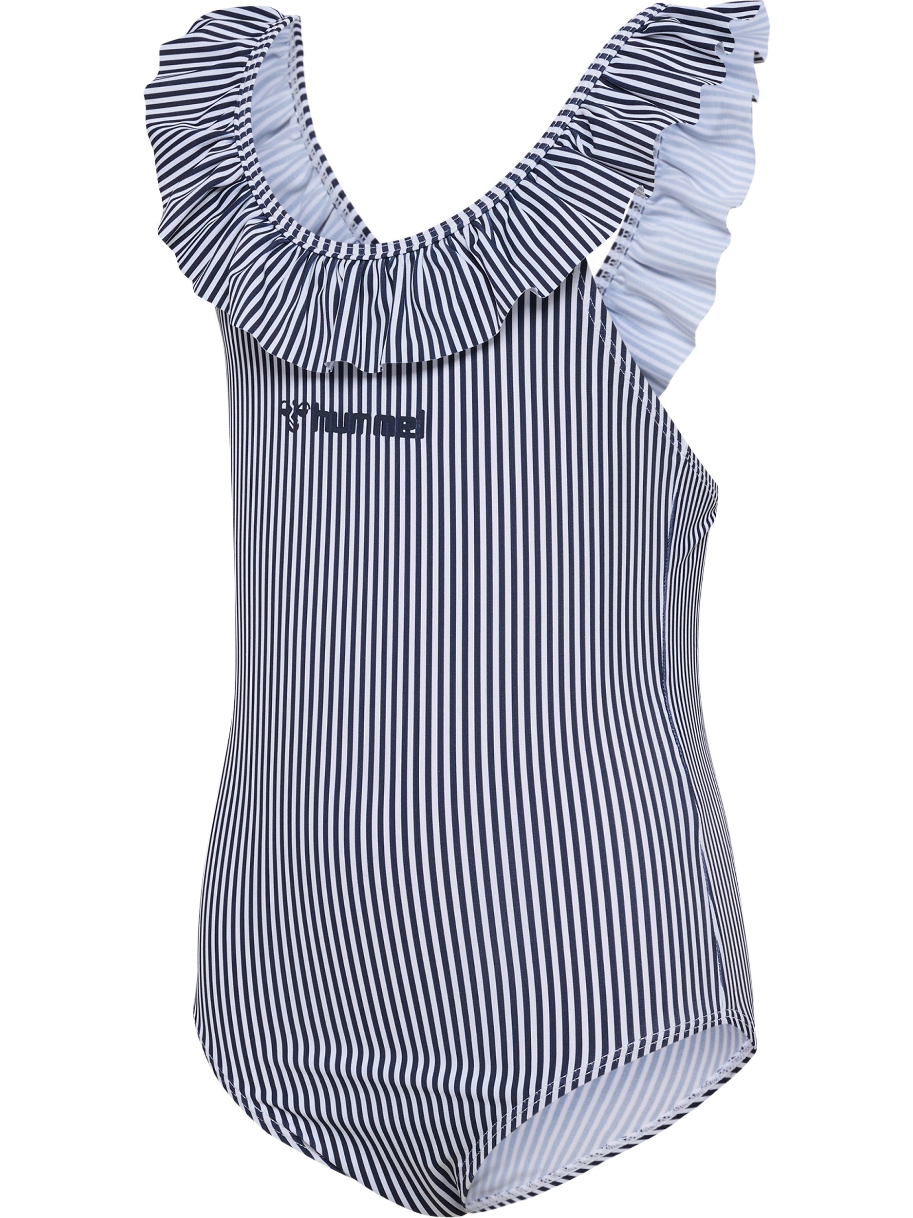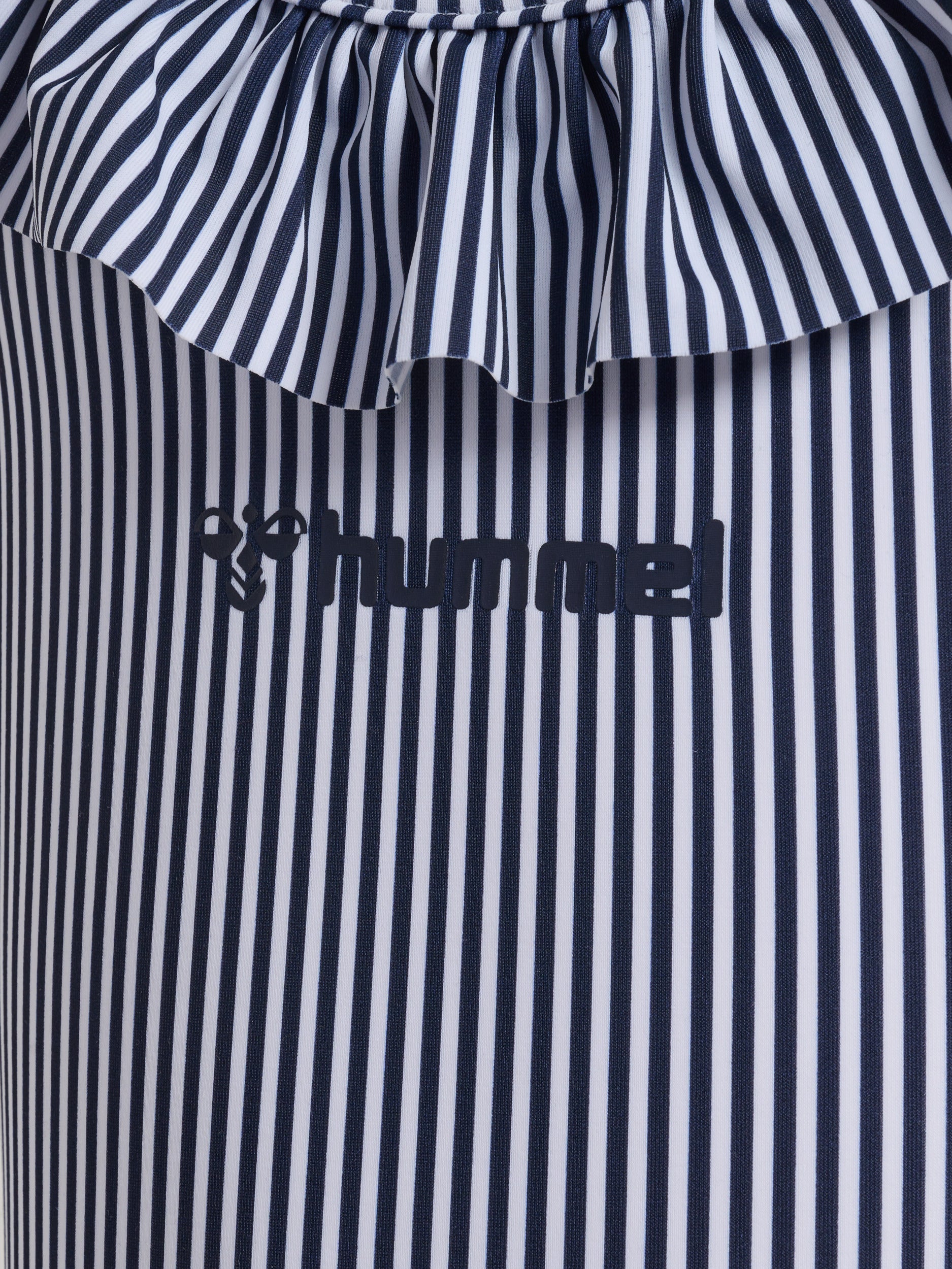 hmlFRILLI T-skjorte er laget av mykt, strikket jerseystoff som sikrer god komfort under svømming. Den har et søtt stripemønster med flæser og et hummel logo trykk på fronten.