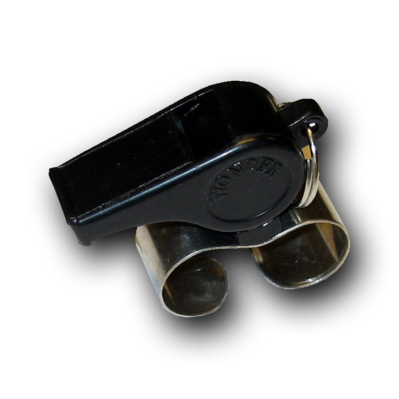 Sort dommerfløyte med fingergrep. Perfekt å benytte i kampsituasjon.